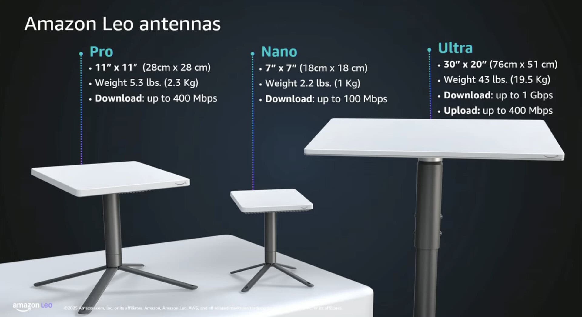 Amazon Leo is building three types of antennas — Nano for the mobile market, with terminals small enough to fit in a backpack; the Pro; and the 40-pound Ultra for corporate markets.