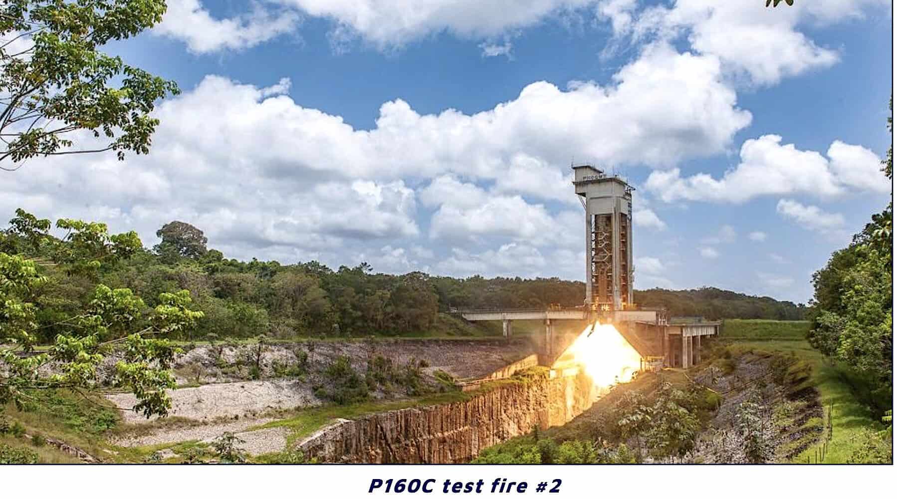 The second test firing of the P160C solid-fueled stage, to boost performance of Ariane 6 and Vega-C. Credit: Avio