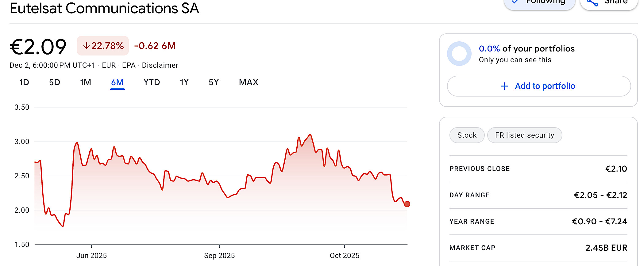 Eutelsat shareholders are accepting a 30% dilution as part of the 1.5-billion-euro capital raise. Credit: Google Finance