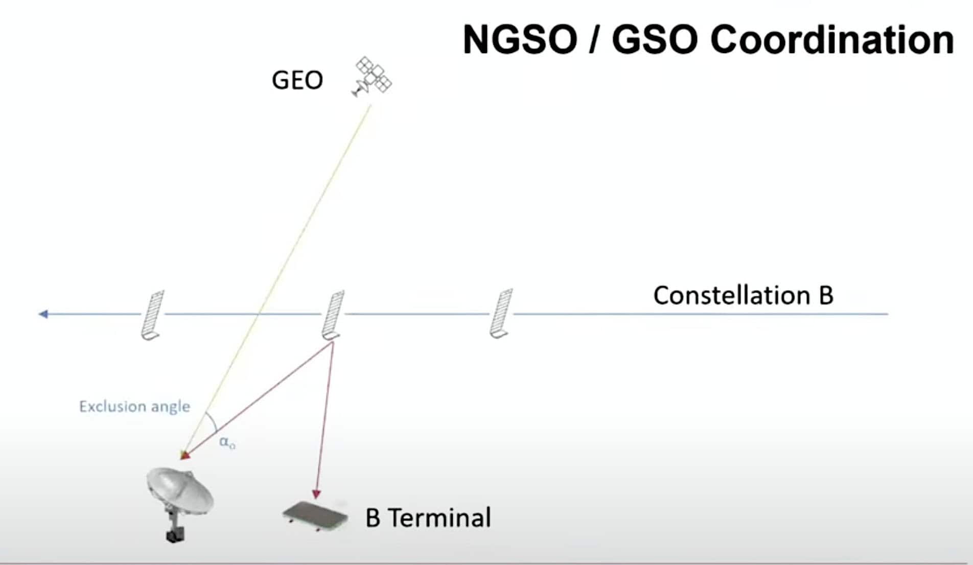 This slide is an illustration showing how NGSO-GEO coordination is supposed to work, based on ITU agreements that were struck, after much debate and resistance from GEO operators, in the 1990s. The rules identify an exclusion zone directly under the GEO arc in which NGSO satellites are not allowed to transmit for fear of interfering with the GEO satellite’s signals.