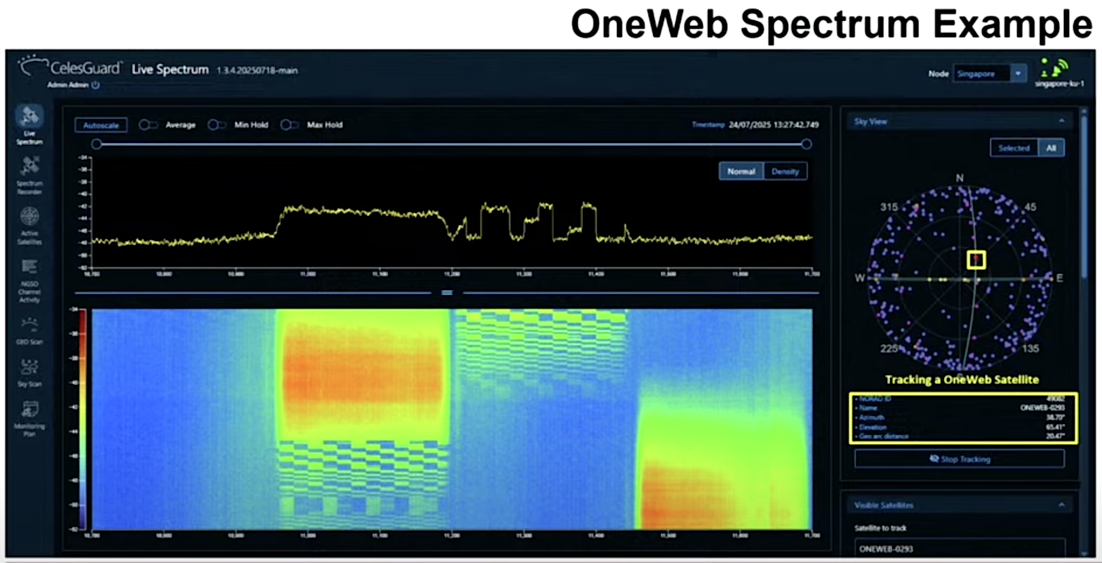 A click on the user interface image highlights a given satellite, in this case a OneWeb spacecraft. At the bottom is a waterfall of the spectrum’s recent use history.