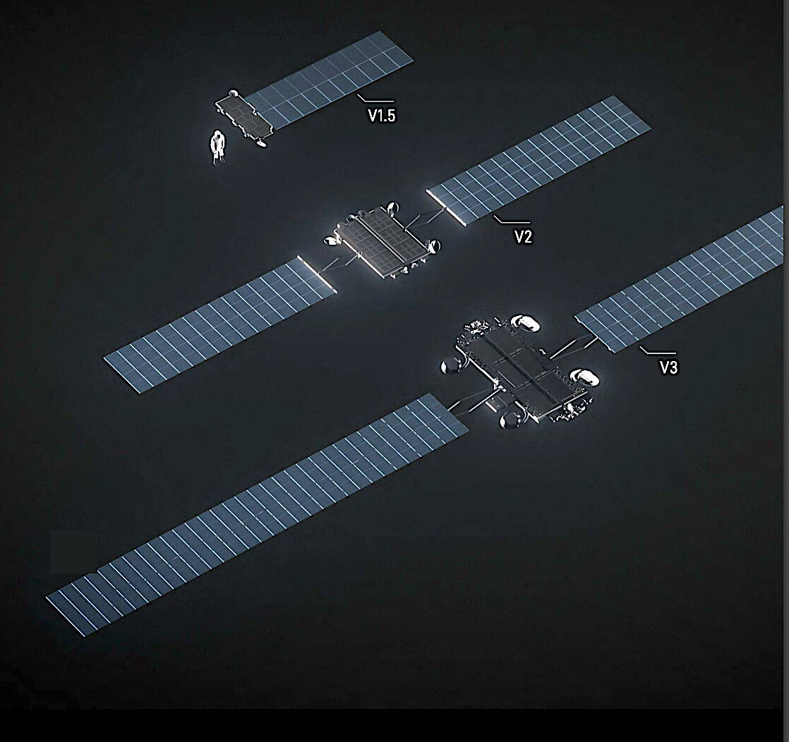 Starlink V1.5, V2 and V3 satellite evolution. Starlink expects the V3 satellites, which launch starting in 2026, to provide more than 1 Tbps of downlin and more than 200 Gbps of uplink, respectively 10x and 24x the performance of the V2 model. Credit: Starlink 2025 Progress Report.